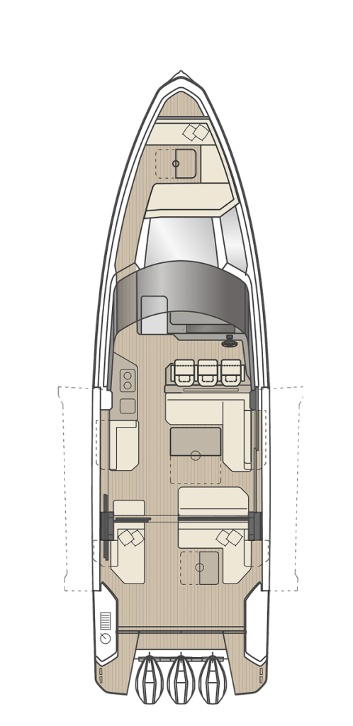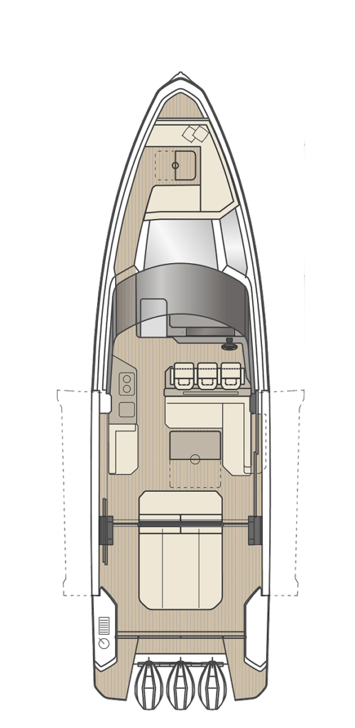 Korak po korak, kormilarnica se otvara. Staklo se pomiče, krov se pomiče unatrag, a terase se spuštaju, pretvarajući brod iz mirnog i zatvorenog u jednu neprekidnu glavnu palubu, povezanu s okolinom.